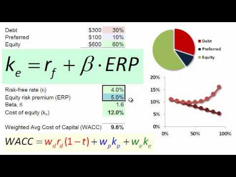 The percentage cost of capital takes the marginal cost of capital and multiplies that by the proportional cost of capital. To continue illustrating with the above example, Company A uses $7K at 7% of debt at 44.44% of total capital that equals a proportional rate of 3.11%. Using the same reasoning for the $50K of equity at 12% and $75K of owner financing at 0%, WACC becomes 3.11% + 2.66% + 0%=5.77%/3=1.9233%. So the weighted average cost of capital is 1.9233% and is a more accurate representation of Company A's cost. The video below further illustrates the cost of capital calculation.